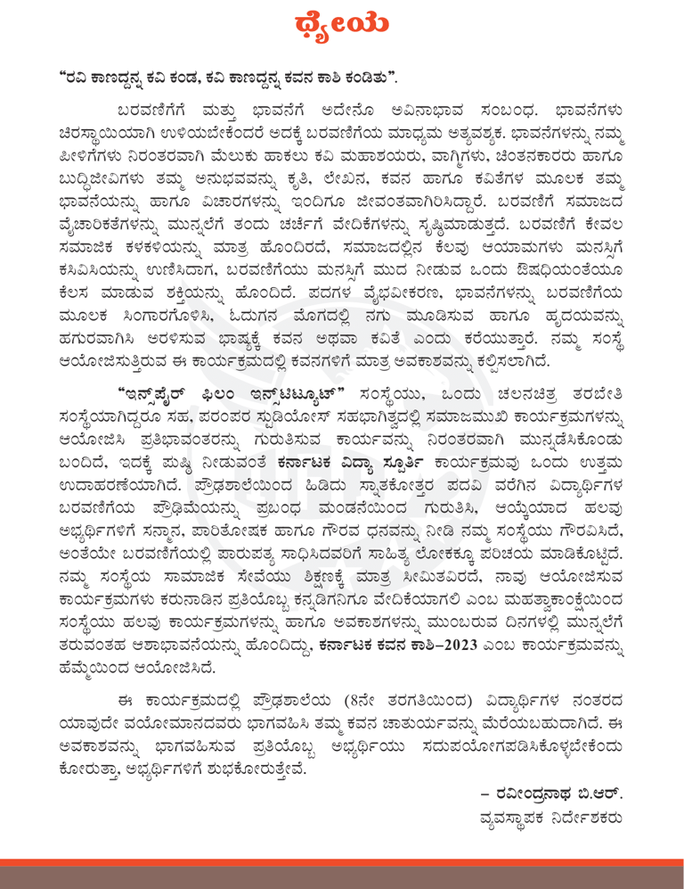 Under this prestigious program, we offer students from all over Karnataka who have dexterity writing skill in literature field or well known about Kannada dictionary to present their 6 lines of poetry on paper, which is delivered and written on their own irrespective of their grades i.e., High school, Pre University (PUC), Graduation and Post-Graduation. Once creative poetry chosen by our jury members we felicitate those winners with paying our homage along with award and rewards, for who shown their proficient writing skill to enrich literature. And also, selected poetry which is not plagiarised will be binding in the books and publish the same from our Institute.